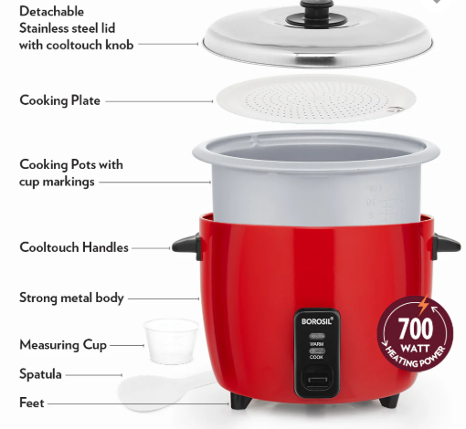 The Borosil Pronto Dual Electric Rice Cooker, 1.8L is easy in every way – put in the rice and leave it – it will stop when done to perfect consistency. You don’t need to keep watching over it and keep checking to see if it’s over or under cooked.