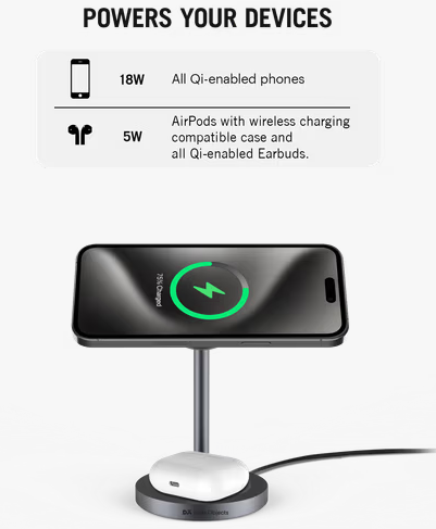 Charges MagSafe-enabled iPhones and other Qi-enabled phones with maximum output of up to 18W, and AirPods/Earbuds up to 5W with a 20W adapter