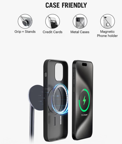 Universal metal ring included to wirelessly charge Non-MagSafe, Qi-enabled phones
