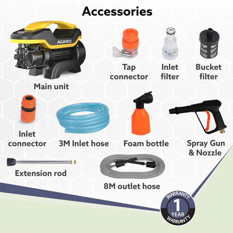 - Includes 3 meters inlet pipe, 8 meters outlet hose, spray gun extension rod,1 inlet filter, 1 inlet connector,1 tap connector, 1 bucket water filter, foam spray bottle