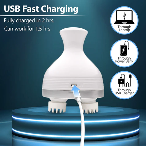 - The electric hair scalp massager is powered by a rechargeable lithium-ion battery, so no need to plug in while in use. The massage tool comes with a charging base and a power adaptor. Its compact, cordless portable design allows you to massage anywhere on-the-go