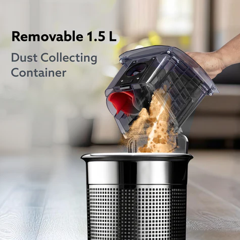 - The 1.5 litres bagless bin is designed for hygienic removing and emptying with one hand, which helps minimize dust clouds