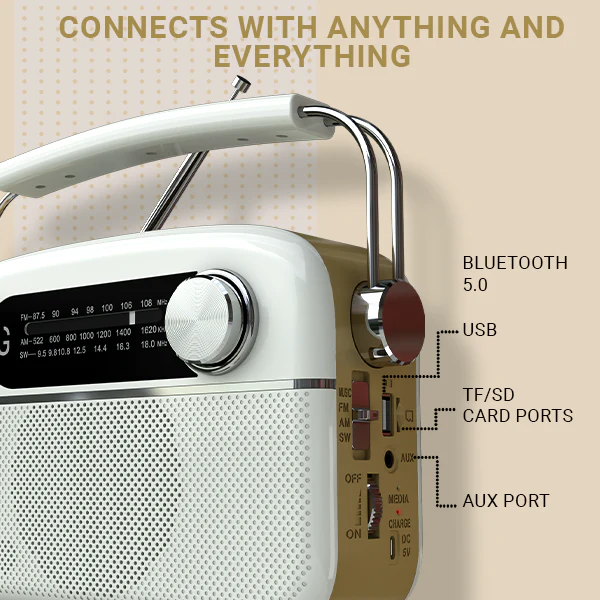 - While it’s a radio, this retro wireless speaker is equipped with three radio bands FM, SW, and AM. So, what are you waiting for? The Evoke Retro Speaker is a great speaker & modern radio which also comes with a solar charging.