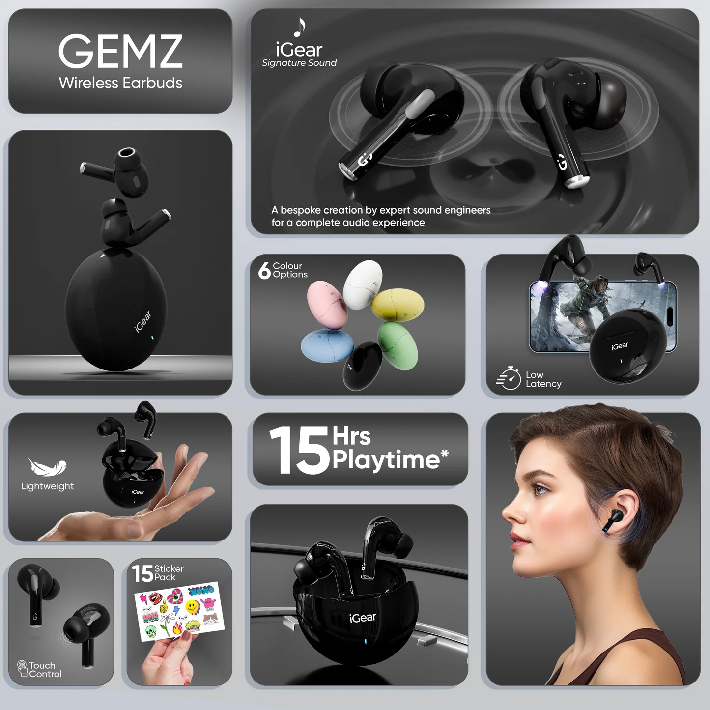 - Introducing the iGear Gemz Wireless Earbuds – your perfect audio companion. Experience crystal-clear calls and enjoy HiFi stereo sound with powerful bass. Choose from 5 colourful designs. These splash-resistant earbuds fit comfortably with touch controls for easy use. With the advanced Bluetooth chip, auto-quick pairing is a breeze. Enjoy fast charging, and with up to 15hours of battery life, immerse yourself in uninterrupted music anytime, anywhere. Upgrade your audio experience with iGear Gemz Earbuds now!