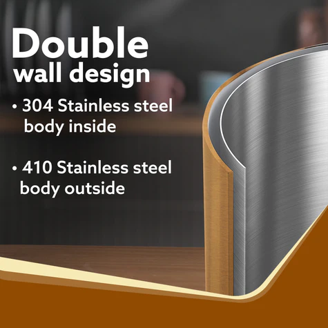 - Double Layered body with Food Grade 304 Stainless Steel Body inside and 410 Stainless Steel body outside along with Cool Touch Handle