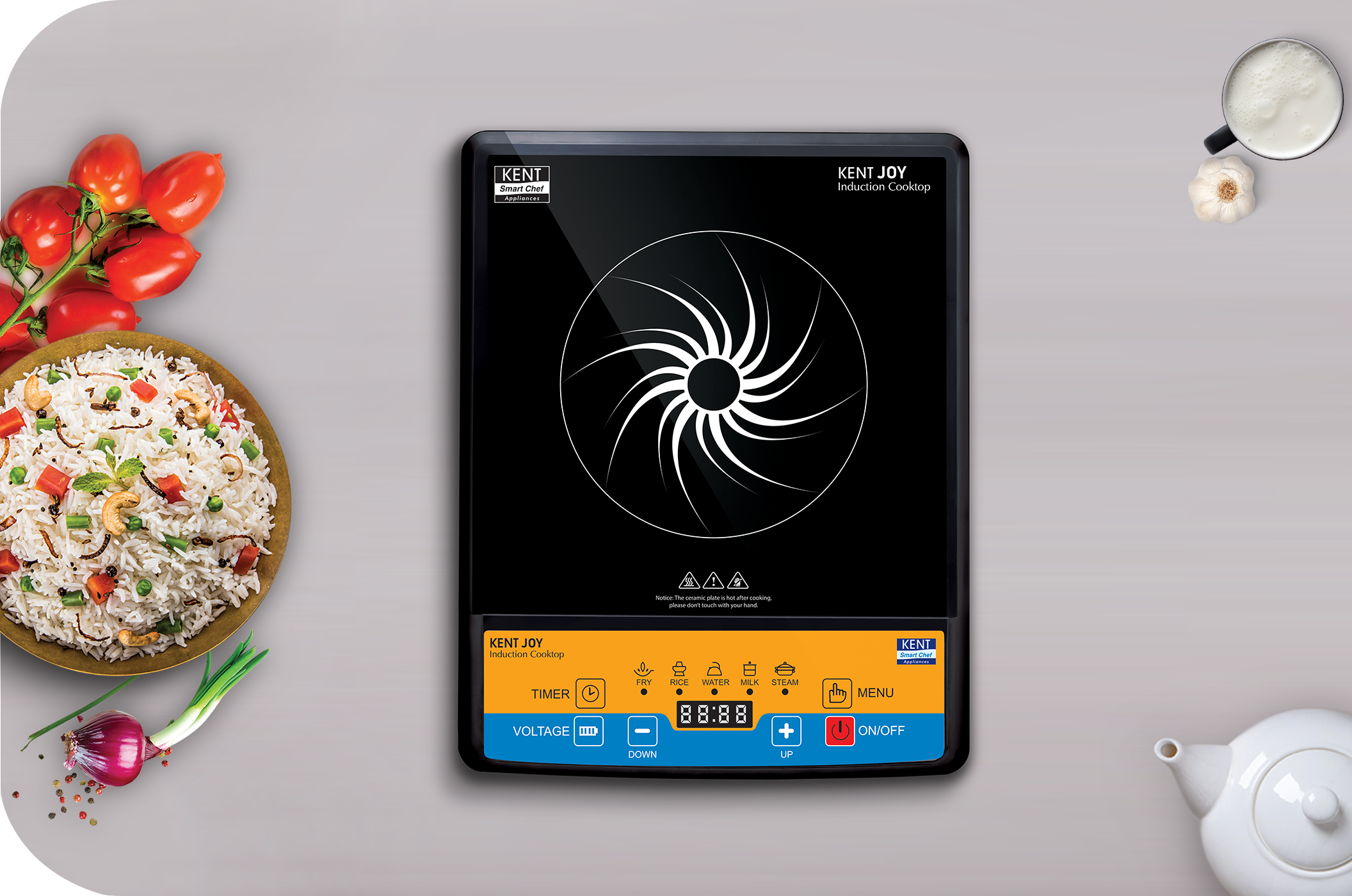 KENT Joy Induction Cooktop offers 5 preset options including Fry, Steam, Water, Milk, and Rice for your convenience. The feature lets you cook dishes without adjusting the temperature manually. You can use any option with a single touch of button. .