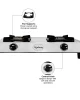 This ISI certified 2 burner gas stove features a manual ignition cooktop with a stainless steel body, ensuring durability and easy cleaning. Compatible with LPG, it comes with a 1-year manufacturer’s warranty.