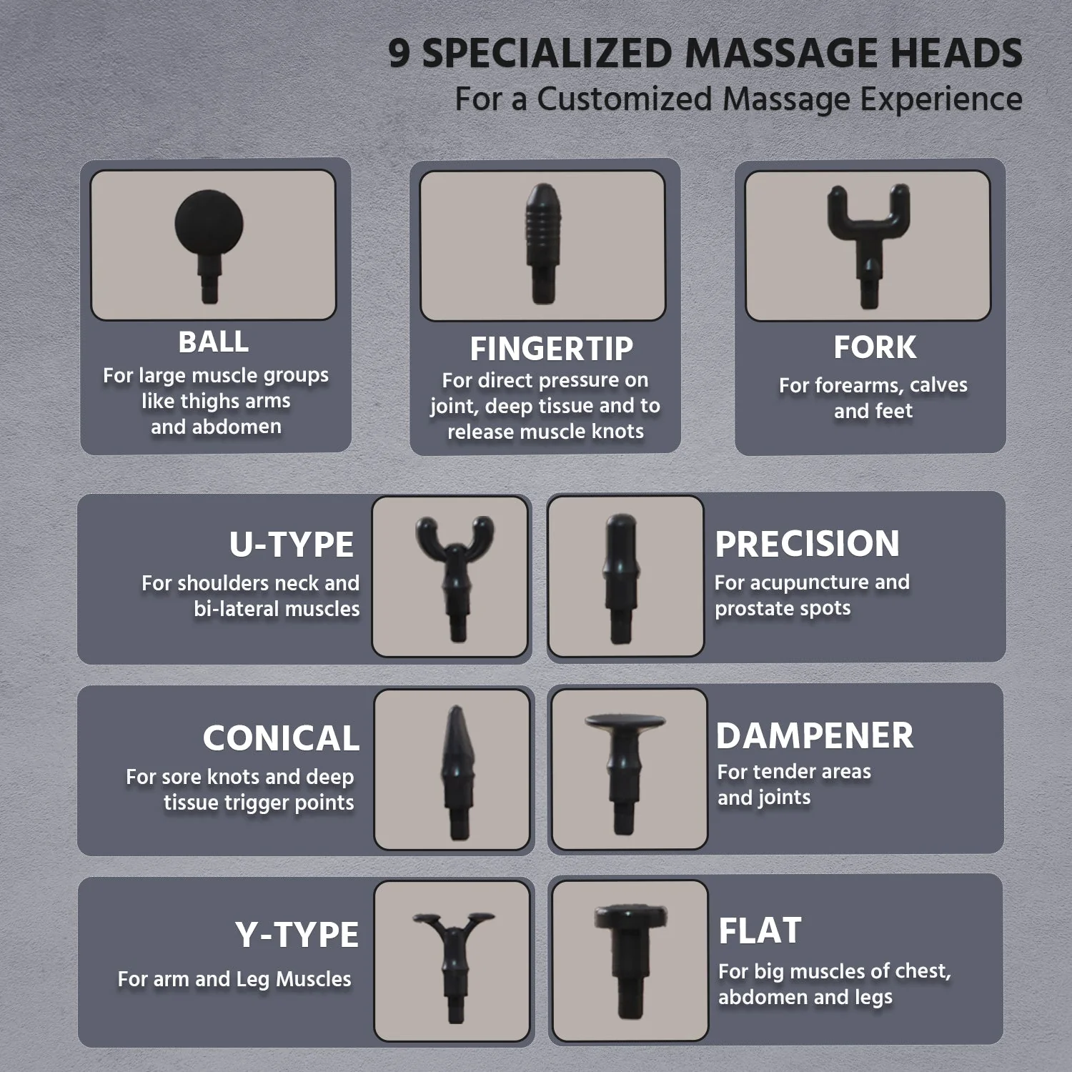Lifelong deep tissue body massager with 6 specialized heads for full-body pain relief.