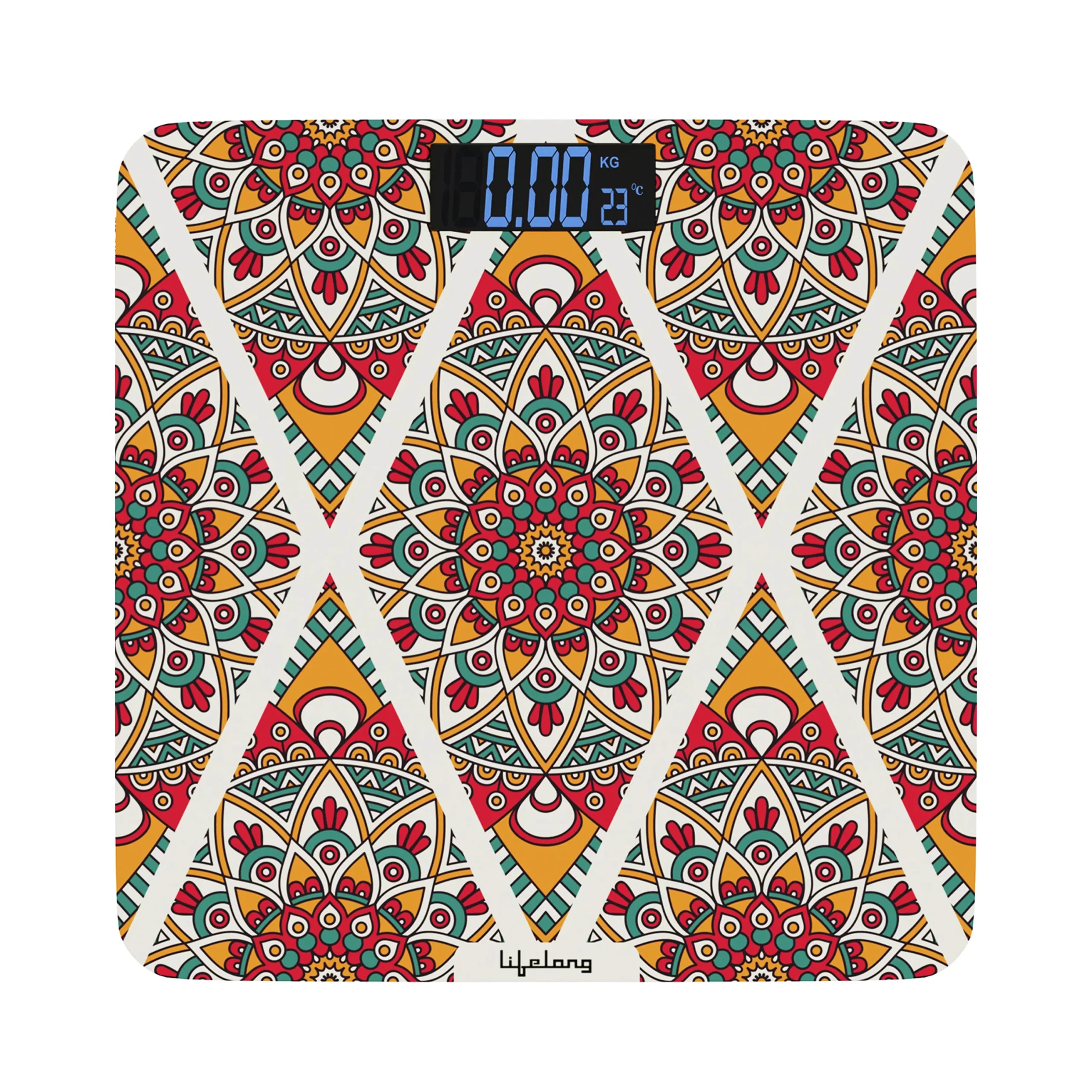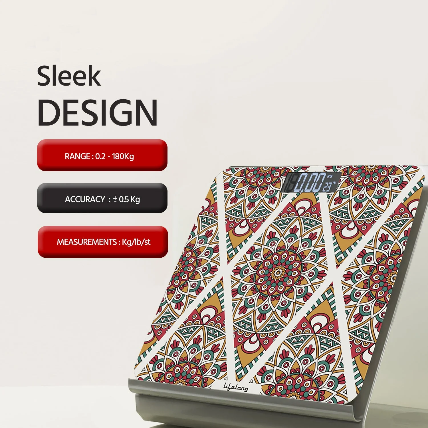 Stylish digital weighing scale inspired by Rajasthan’s culture, featuring thick tempered glass and an LCD display.