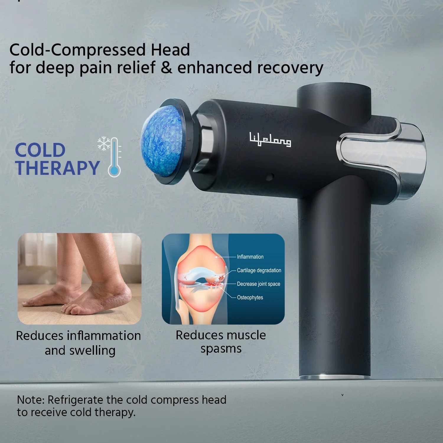 The Lifelong Gun Massager, featuring cold compression and 99 speed settings for customized deep tissue percussion. Equipped with five massage heads and three modes, it’s designed for full-body use, soothing muscles in the back, neck, shoulders, hands, feet, head, and legs.