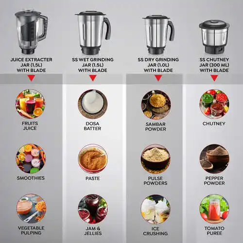 - CAPACITY of JARS: Wet Grinding Jar: 1.5L, Dry Grinding Jar: 1L, Juicer Jar: 1.5L and Chutney Jar: 300ml, grinds tough ingredients with ease.