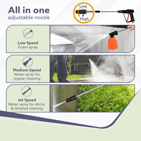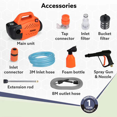 - Includes: 3M Inlet hose, 8M outlet hose, Gun with extension rod, Filter, Connector, Foam Bottle