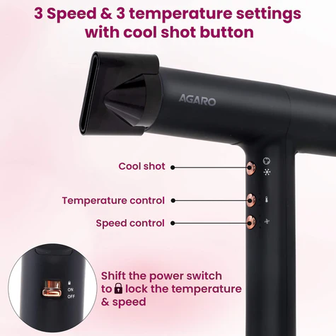 3 Speed and 3 Temperature settings with cool shot button. Comes with a memory function. Remembers your previous settings when you reuse the Hair Dryer