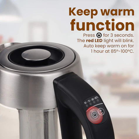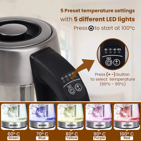- Comes with 5 temperature settings to meet the different brewing needs. The color of the LED indicator varies from the different temperatures you choose. 60ƒ?Ÿ(Green) for delicate Tea, 70 (Blue) for white Tea, 80 (Yellow) for green tea, 90 (Purple) for black tea, 100ƒ?Ÿ(Red) for coffee, instant noodles, oatmeal, Keep worm, etc