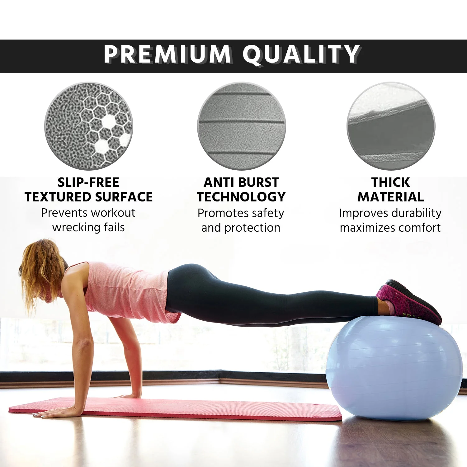 Enhance your home workout with our anti-burst gym ball, perfect for cardio, core exercises, and physiotherapy.