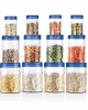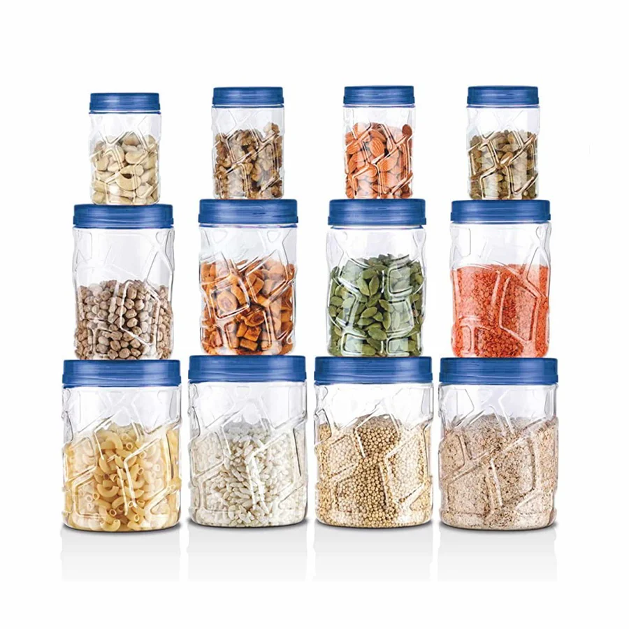 Colour: Blue; Material: Plastic; Package Content: 24-Pcs Vitro Jar Set(6pcs x 300 ml Each, 6pcs x 700 ml Each, 6pcs x 1.4 ltr Each, 6pcs x 2 ltr Each); Dimension in cm (L x W x H): Refer Image for Dimensions of each Jar