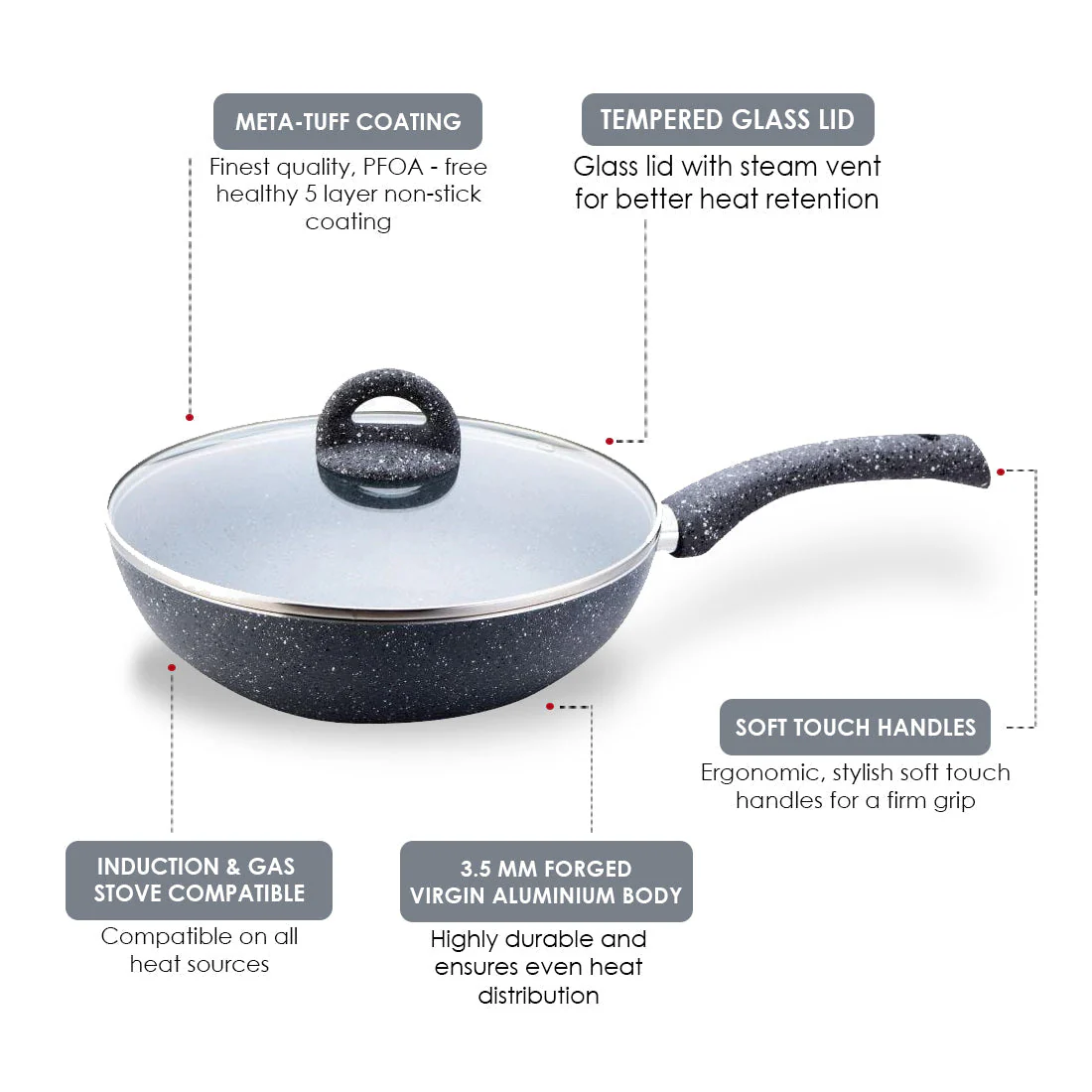 Enhance your cooking and dining experience with the most popular Wonderchef Granite Wok. The granite finish gives the aluminium cookware a stylish and modern look. Wonderchef Granite Wok is perfect for stir-frying and everyday cooking. Evoke the inner chef in you and cook healthy, low fat and delicious meals at home.